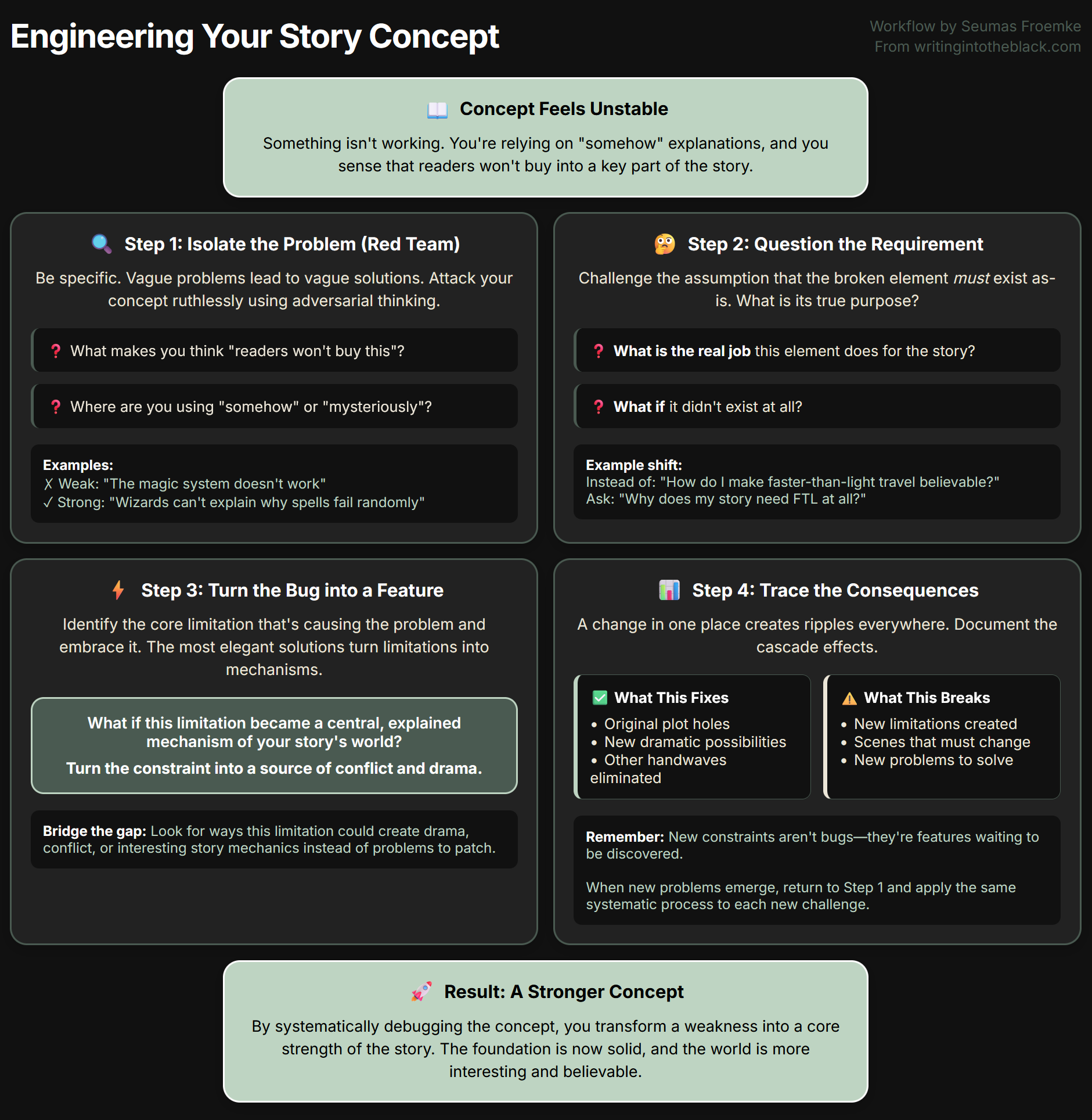 You may already sense this process instinctively. Every time you read a scene and think this doesn't feel right, you're performing a diagnostic. This method gives you a structured framework to amplify and trace those instincts to a solution. Instead of worrying about problems or patching around them, you systematically turn them into features.